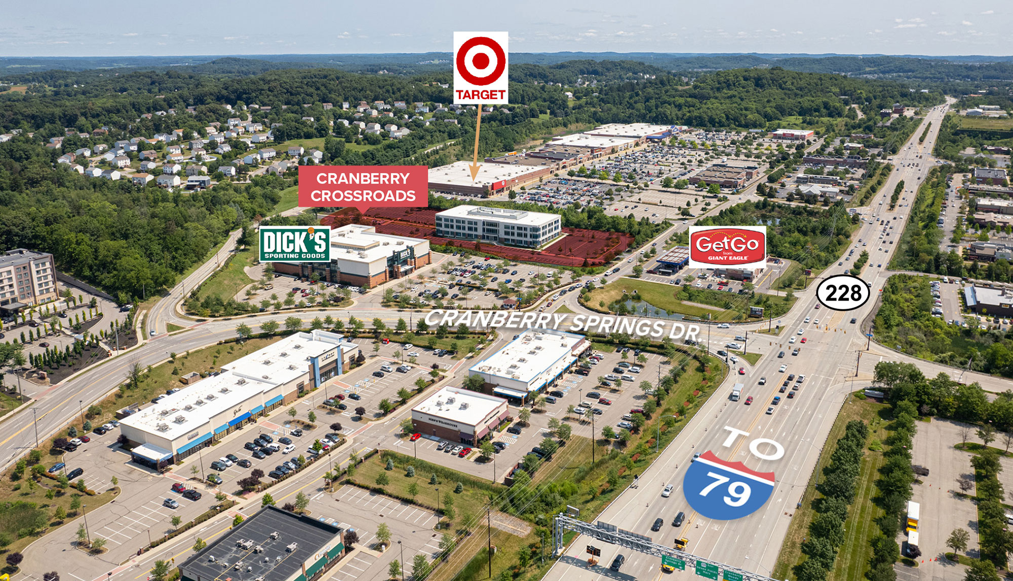Located in the heart of Cranberry Township along Route 228, Cranberry Crossroads connects to everywhere you want to be. The building is just off the I-79 interchange, only 1.5 miles to Route 19, and two miles to the PA Turnpike. Setting it apart from other office buildings in the area, Cranberry Crossroads is walkable to numerous restaurants and other retail amenities, including Starbucks, Burgatory, Chipotle, Juniper Grill, Anthony’s Coal Fired Pizza, Dick’s Sporting Goods, and Target, all in the immediate vicinity.